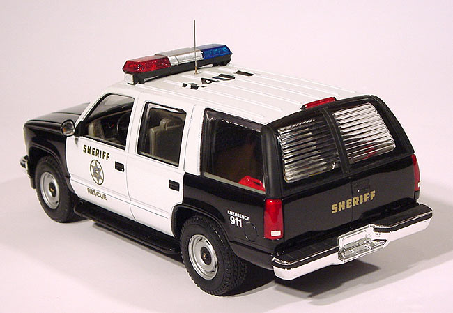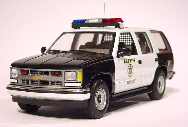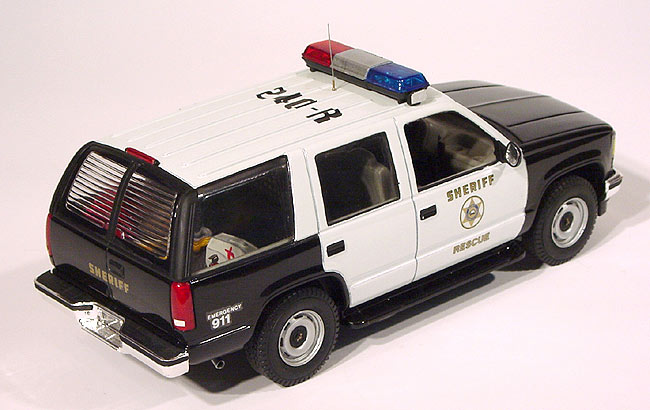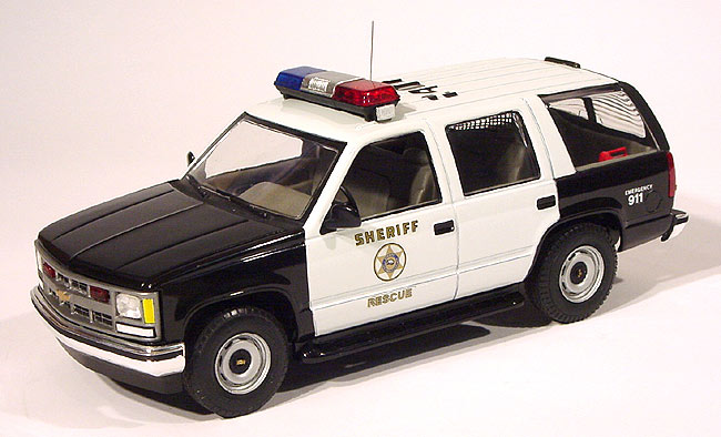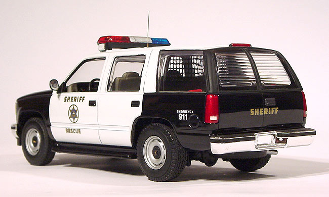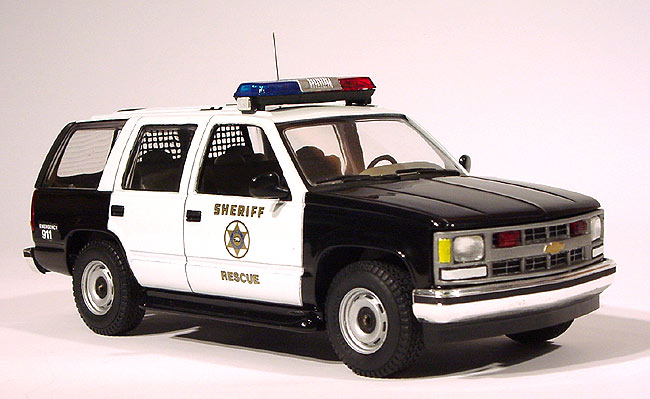1996 Chevy Tahoe LA County Sherriff's Vehicle- (built 1998) For this LA County Sheriff's vehicle I used Ertl's snap '96 Chevy Tahoe kit. The toughest part of this project was modifying the kit's double headlight grill into the real truck's single headlight grill. I made a master model but it was too flimsy to use in the final model so I ended up making my own resin cast duplicate for the completed model. The wheels are also my own resin pieces taken from a mold made from the spare tire molded into the chassis. The rear doors were modified into the double side opening style which required me to make a casting of the door handle to relocate it. The graphics are decals from Fred Cady. This model was also featured in Terry Jesse's "Light Commercial" column in Scale Auto Enthusiast magazine.